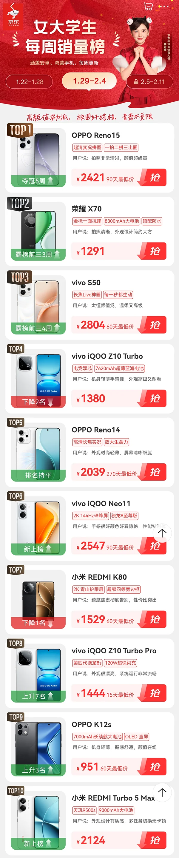 1月29日至2月4日的“女大学生每周手机销量榜”TOP10依次是OPPO Reno15、荣耀X70、vivo S50、iQOO Z10 Turbo、OPPO Reno14、iQOO Neo11、REDMI K80、iQOO Z10 Turbo Pro、OPPO K12s、REDMI Turbo 5 Max。其中,OPPO Reno15连续5周夺冠,荣耀X70霸榜前三3周,新品REDMI Turbo 5 Max也成功上榜。